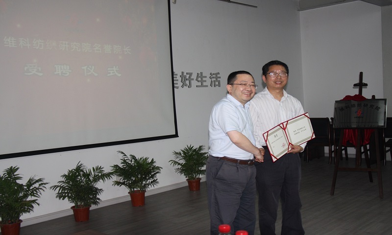 集團領導陳國榮和沈謙祥共同完成了紡織研究院的揭牌,并由集團領導呂軍為陳運能院長頒發了紡織研究院名譽院長的聘書。