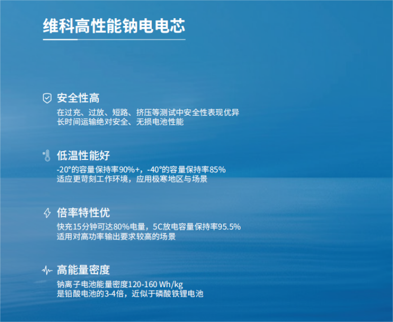 維科技術為本項目交付的鈉離子電池,容量為230Ah,具備安全性高、倍率性能高和循環壽命長等突出優勢,即使在零下40℃時仍能保持近85%的容量,在多個儲能和動力應用場景中取得了良好的市場反響。目前,維科鈉電已完成了能量密度160Wh/kg、循環次數超6000次的新一代鈉離子電池技術,性能指標繼續領先業界,并將很快投入量產。