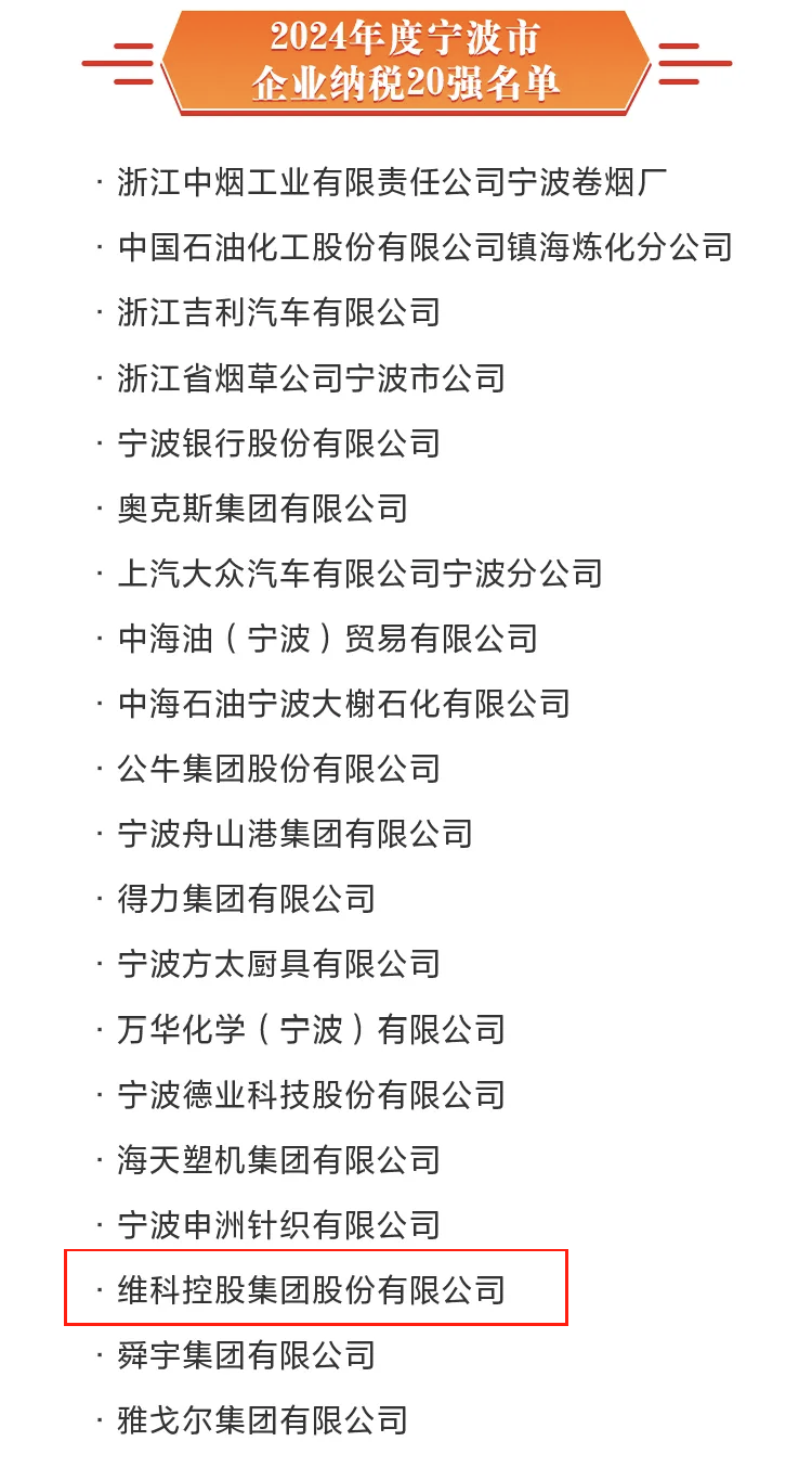 2025年6月13日,寧波“全市推進(jìn)科技創(chuàng)新和產(chǎn)業(yè)創(chuàng)新深度融合 加快民營(yíng)經(jīng)濟(jì)高質(zhì)量發(fā)展大會(huì)”暨“2025寧波創(chuàng)業(yè)創(chuàng)新風(fēng)云榜”榜單發(fā)布活動(dòng)隆重舉行,維科集團(tuán)獲“2024年度寧波市企業(yè)納稅20強(qiáng)”殊榮。