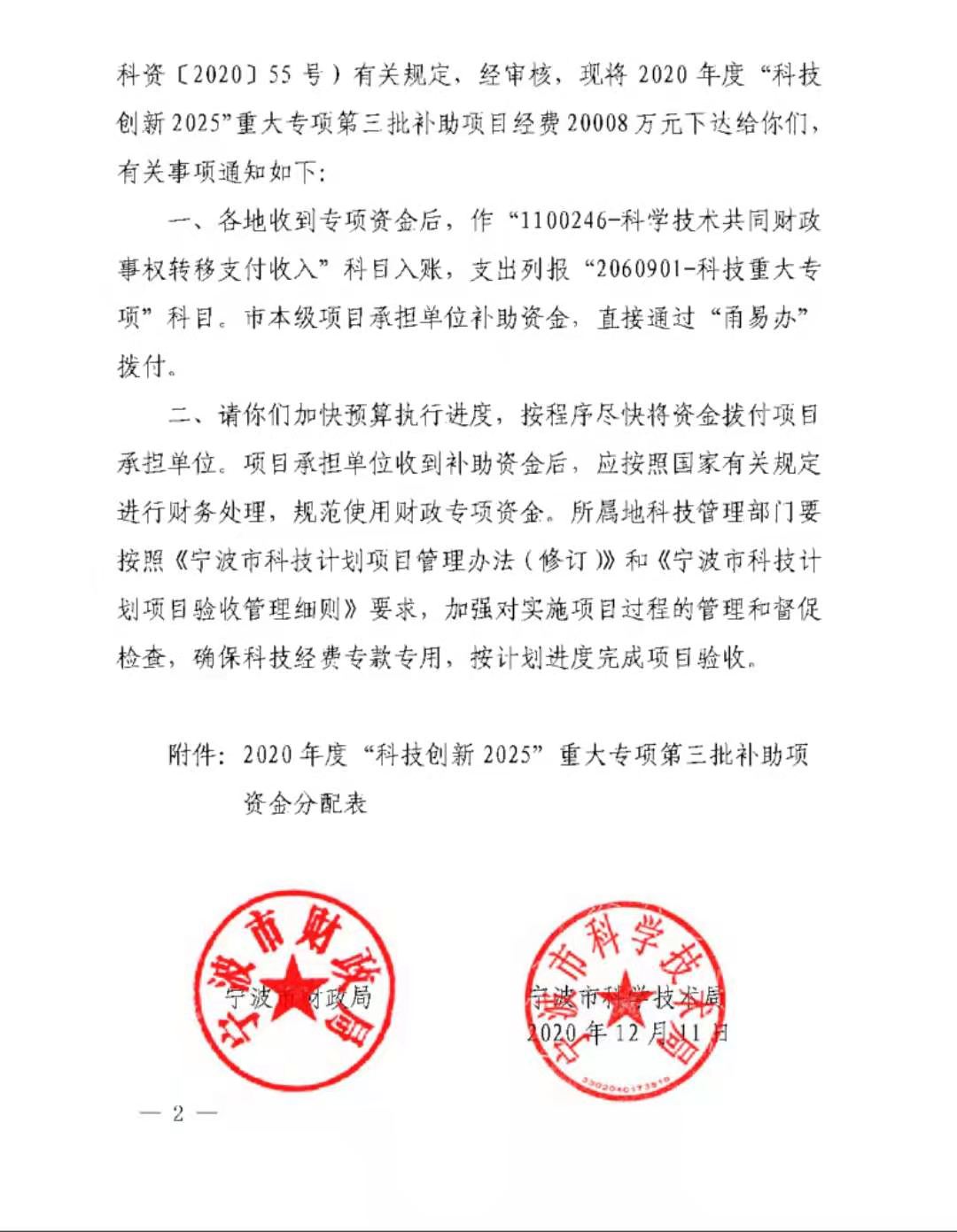 12月15日、寧波市財政局は「寧波市2020年科學技術発展特別基金(第3回バッチ補助金の主要特別プロジェクト)の発行に関する通知」(Ningbo Finance [2020] No.1214)を発行し、寧波VEKEN新エネルギーテクノロジー有限公司が宣言した「高安全?高比エネルギー動力リチウムイオン電池の開発」プロジェクトが採択された。 2020年に寧波市から「科學技術革新2025」大型特別プロジェクトの受注に成功し、第一期の補助金200萬元を獲得した。
