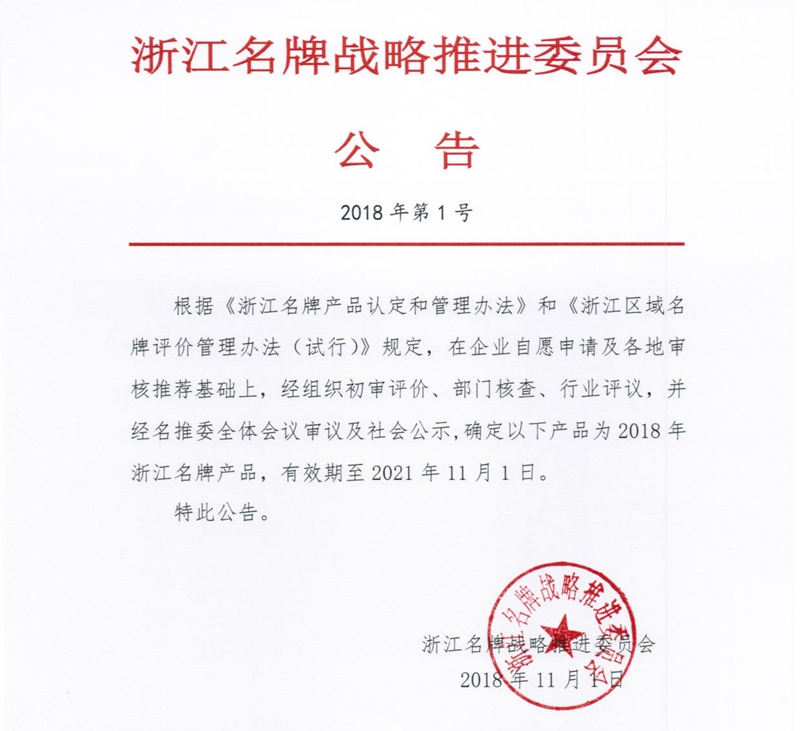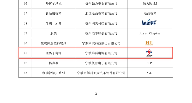 2018年11月1日、浙江省品質技術監督局が授権して、浙江省ブランド戦略推進委員會が選出した「浙江ブランド製品」のリストが盛大に発表され、寧波維科電池有限會社が申告した「リチウムイオンバッテリー」が「浙江ブランド製品」と認定された。